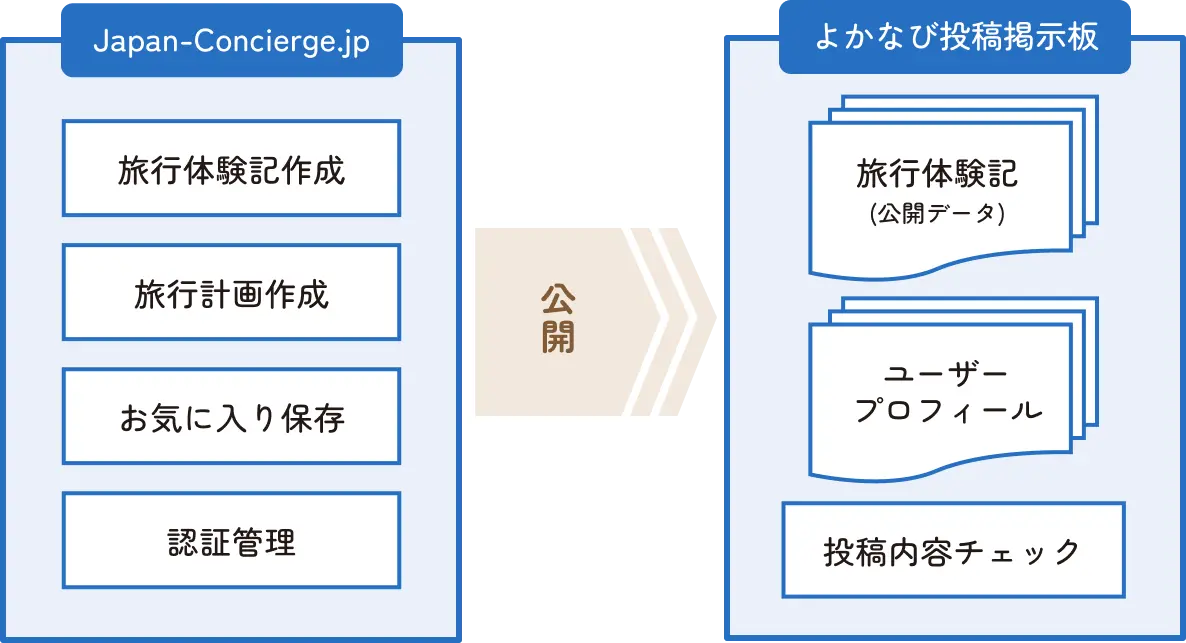 よかなび事務局が運営する「よかなび旅行体験掲示板(みんなの旅行記)」は、株式会社まちづくりプラットフォームの提供する旅行計画・旅行体験記作成システム「Japan Concierge(※)」とシステム連携してます。