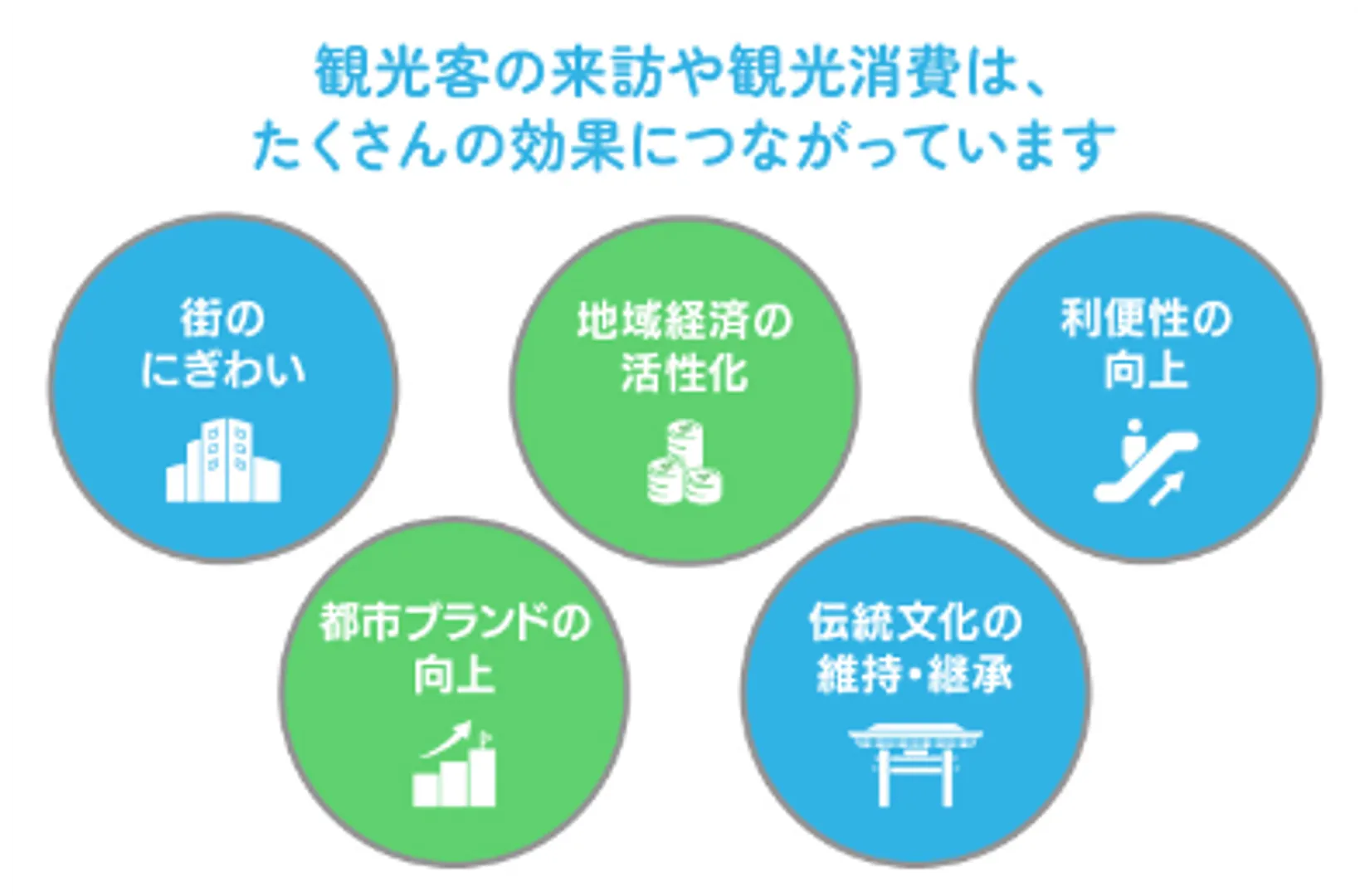 観光客が訪れることや、観光消費によって、消費が経済の活性化以外にも、たくさん効果が期待されます。例えば、観光客が福岡市を訪れ、福岡市で多くの消費をすることは、街のにぎわいや経済の活性化をはじめとしたさまざまな効果を生み出します。また利便性の向上や文化の維持・継承、ひいては都市ブランドの向上など、私たちの暮らしの豊かさにつながっています。