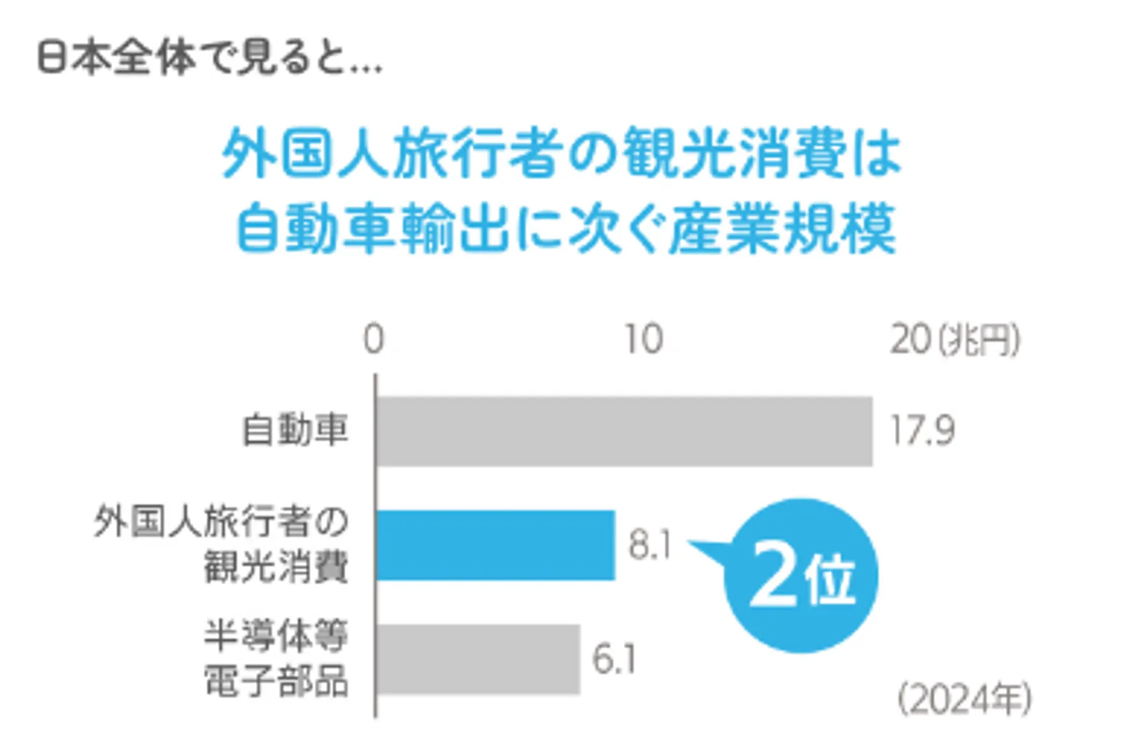 ちなみに、全国でみると外国人旅行者の観光消費額は、日本の主力産業であるイメージが強い自動車の輸出額に次いで、2番目の産業規模となっています。