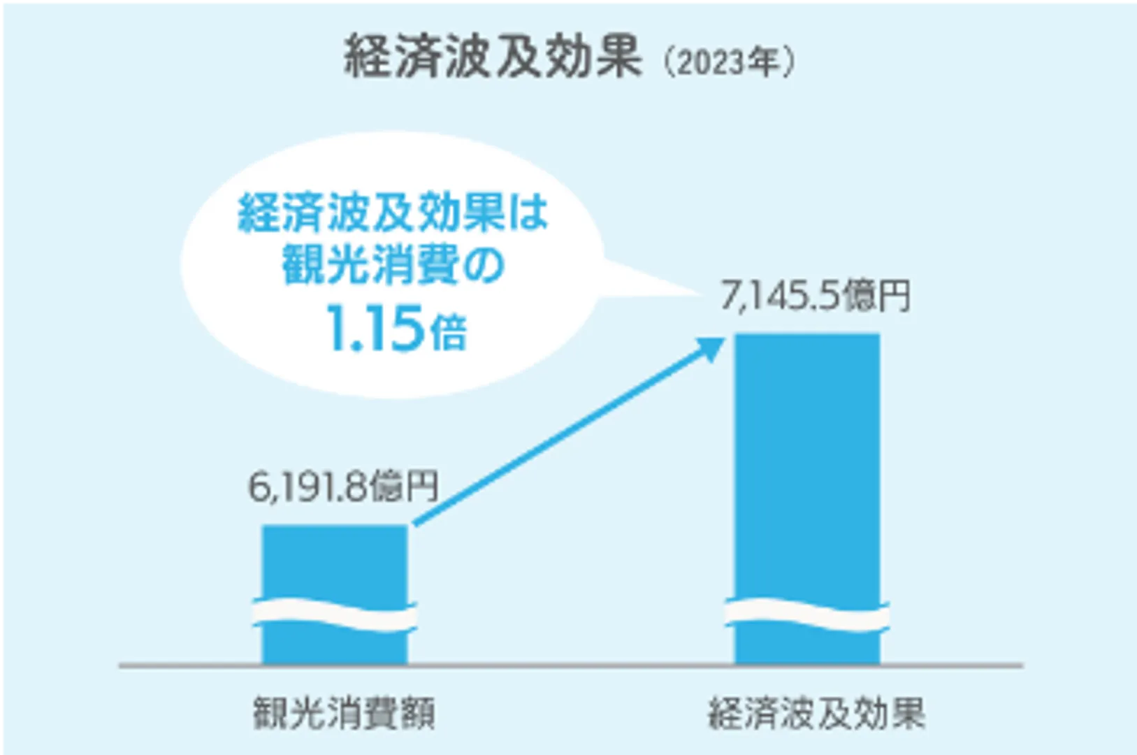 観光消費は、関連する様々な産業へ効果が波及していきます。2023年の観光消費額を基に試算した経済波及効果は7,145.5億円と推計され、市内に1.15倍もの経済波及効果を及ぼしたこととなります。