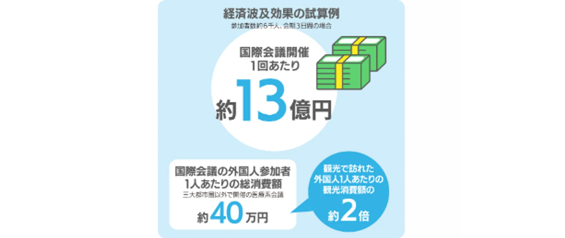 実際に、国際会議開催1回あたりの経済波及効果は13億円と試算されています。