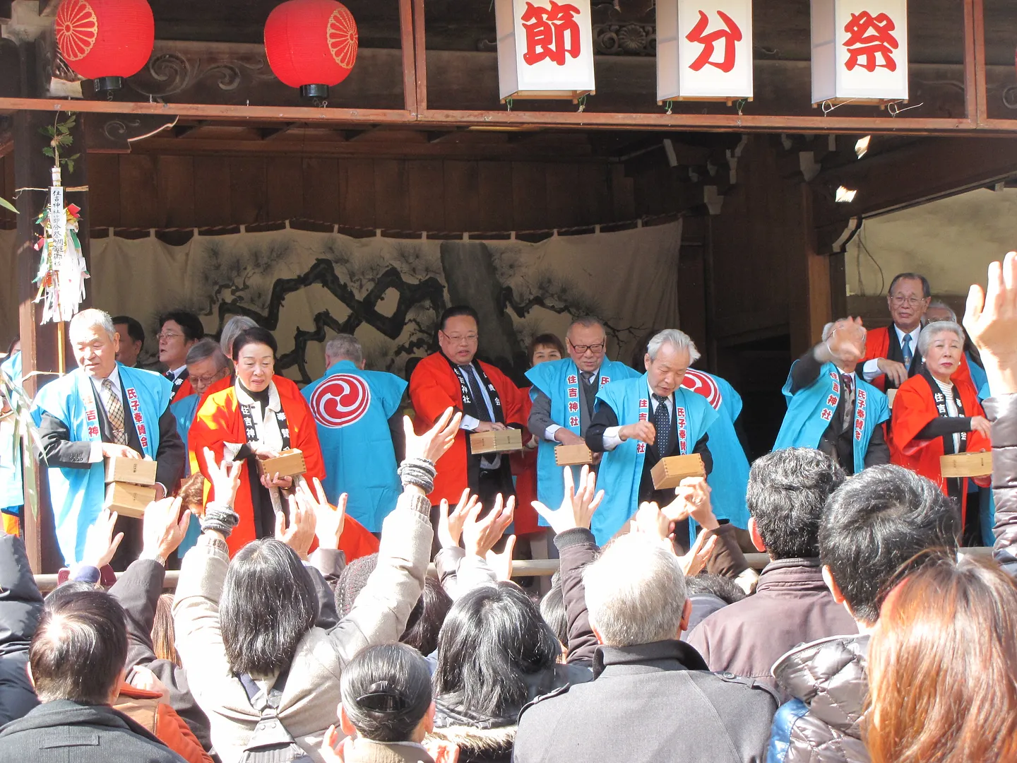 追儺神事の後、神楽殿で午前11時から1時間ごとに豆撒き行事が行われます。