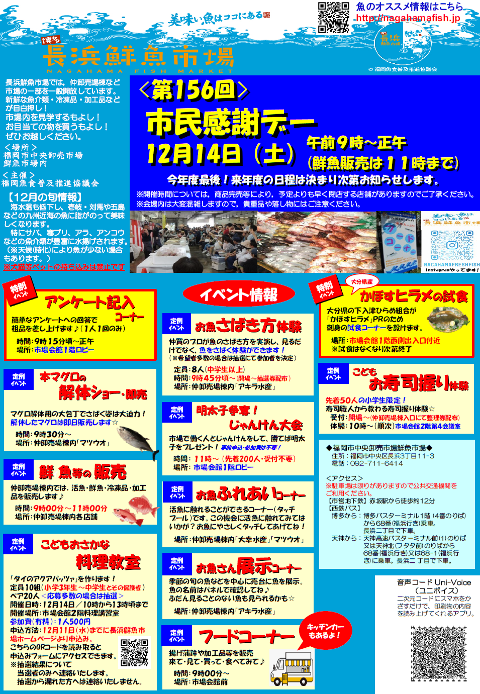 ●長浜鮮魚市場「市民感謝デー」 2024年12月14日(土曜日)9時~12時(鮮魚の販売は9時~11時) ※商品完売等により早めに閉店する店舗がありますのであらかじめご了承ください。
