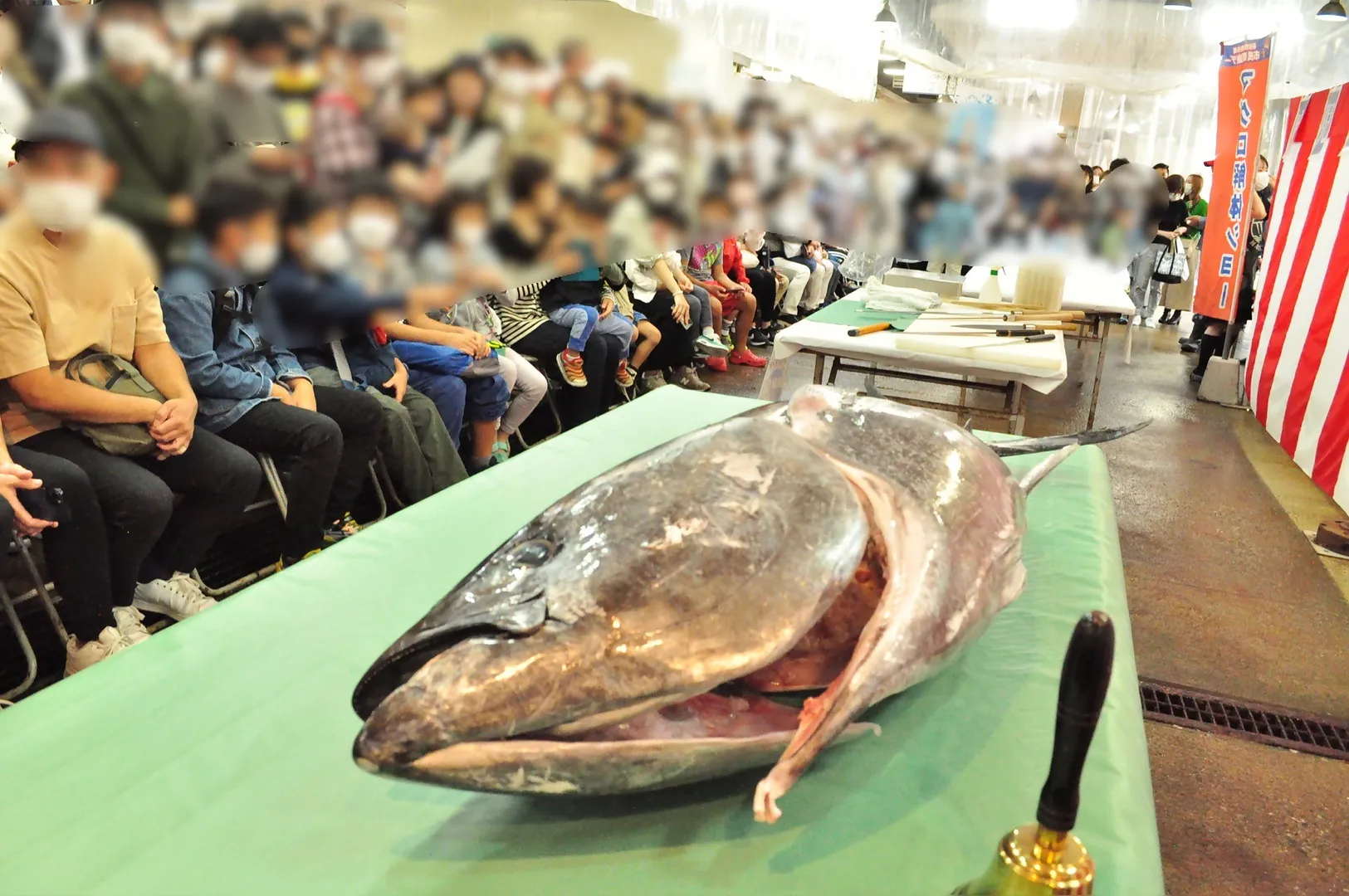 中でも「マツウオ」では、毎回「本マグロの解体ショー」が行われ、解体したマグロを即時販売します。マグロ解体用の大きな包丁でさばく姿は大迫力!!