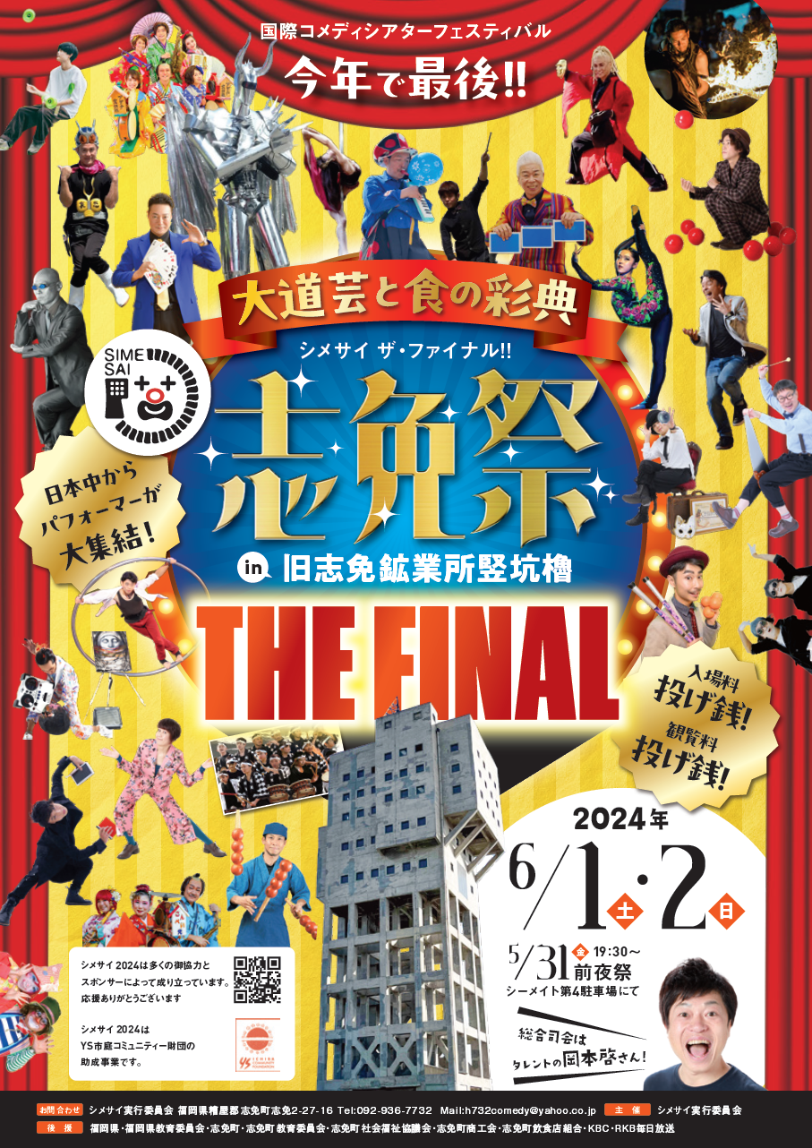 志免祭(シメサイ)2024 ザ・ファイナル!!【志免町総合福祉施設「シーメイト」/旧志免鉱業所竪抗櫓】~日本中からパフォーマーが大集結する大道芸と食の彩典、国際コメディシアターフェスティバル。