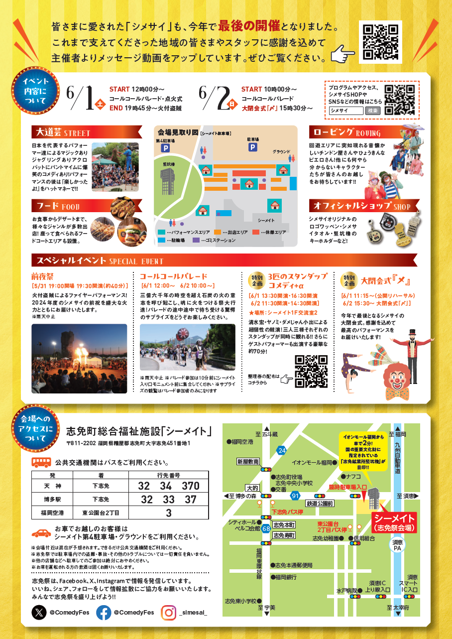※スケジュールや出演者、内容は変更になる可能性があります。最新情報は志免祭(シメサイ)公式サイトやシメサイの各SNSでご確認ください。