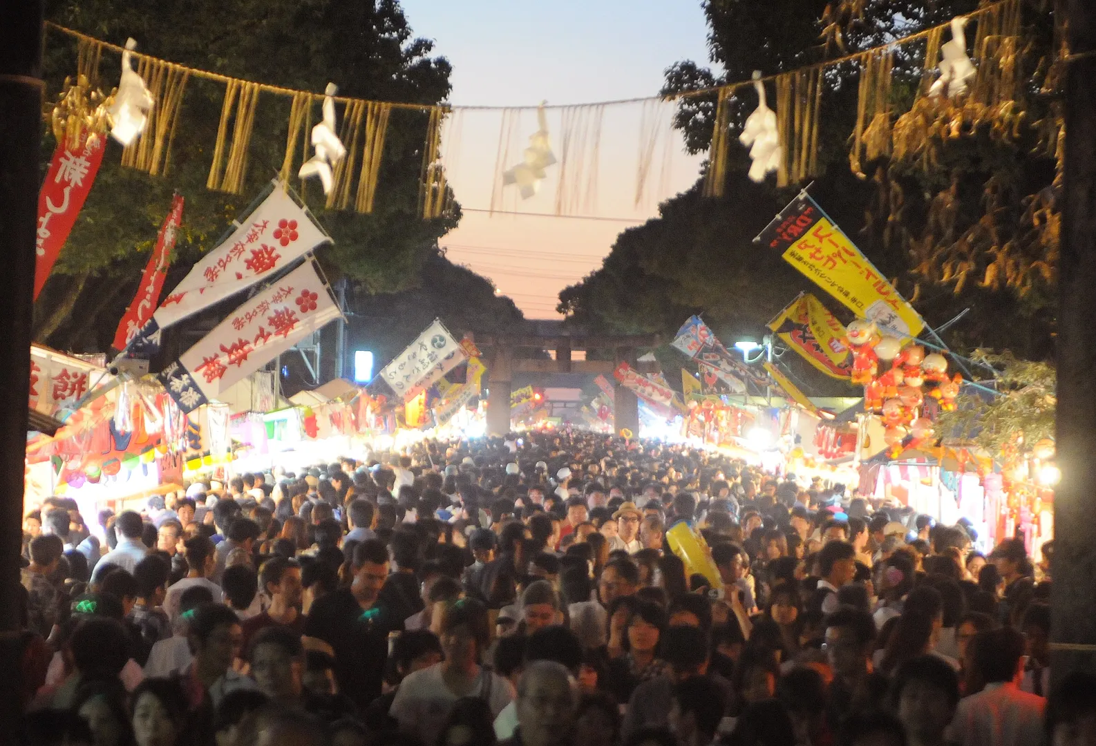 毎年9月12日~18日の七日七夜にわたり様々な神事や数多くの神賑わい行事が執り行われ、お化け屋敷をはじめ射的やヨーヨー釣り、新ショウガの販売など500軒もの露店が参道一帯に立ち並び、連日大変な賑わいをみせます。