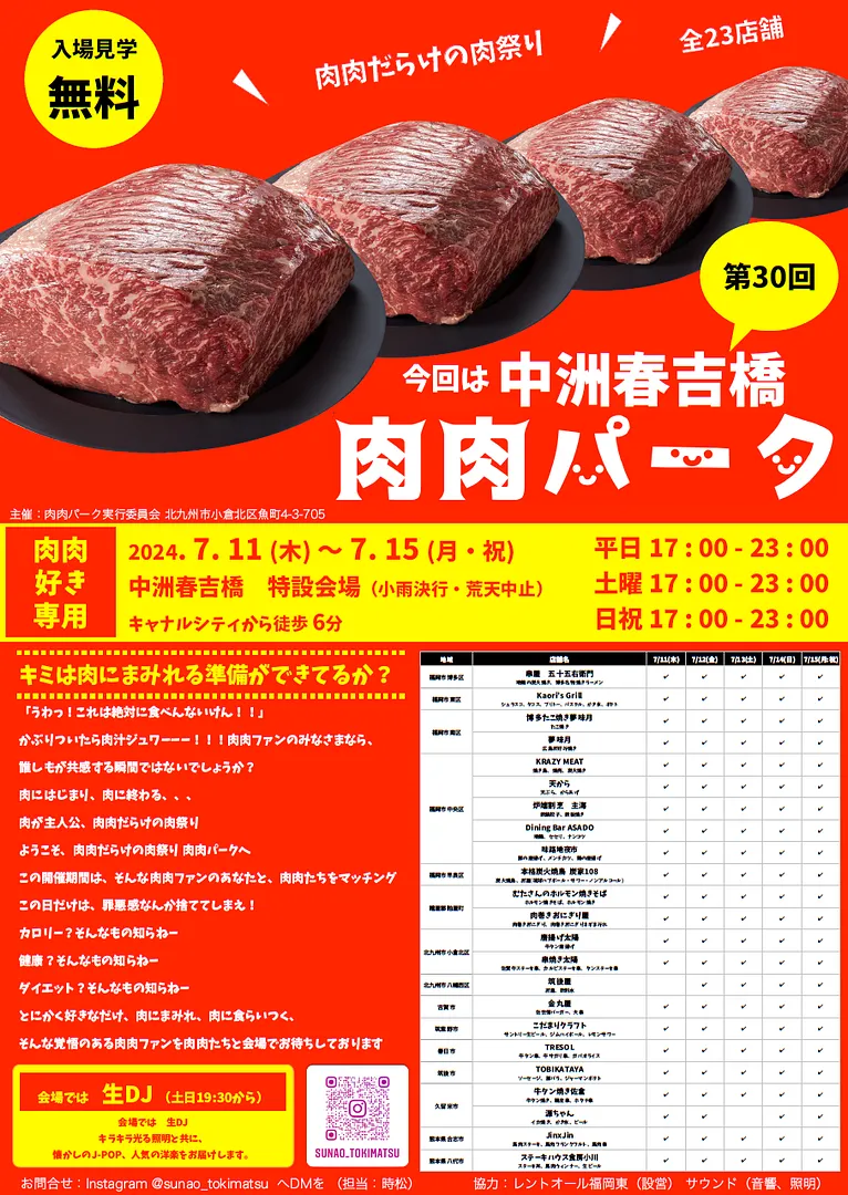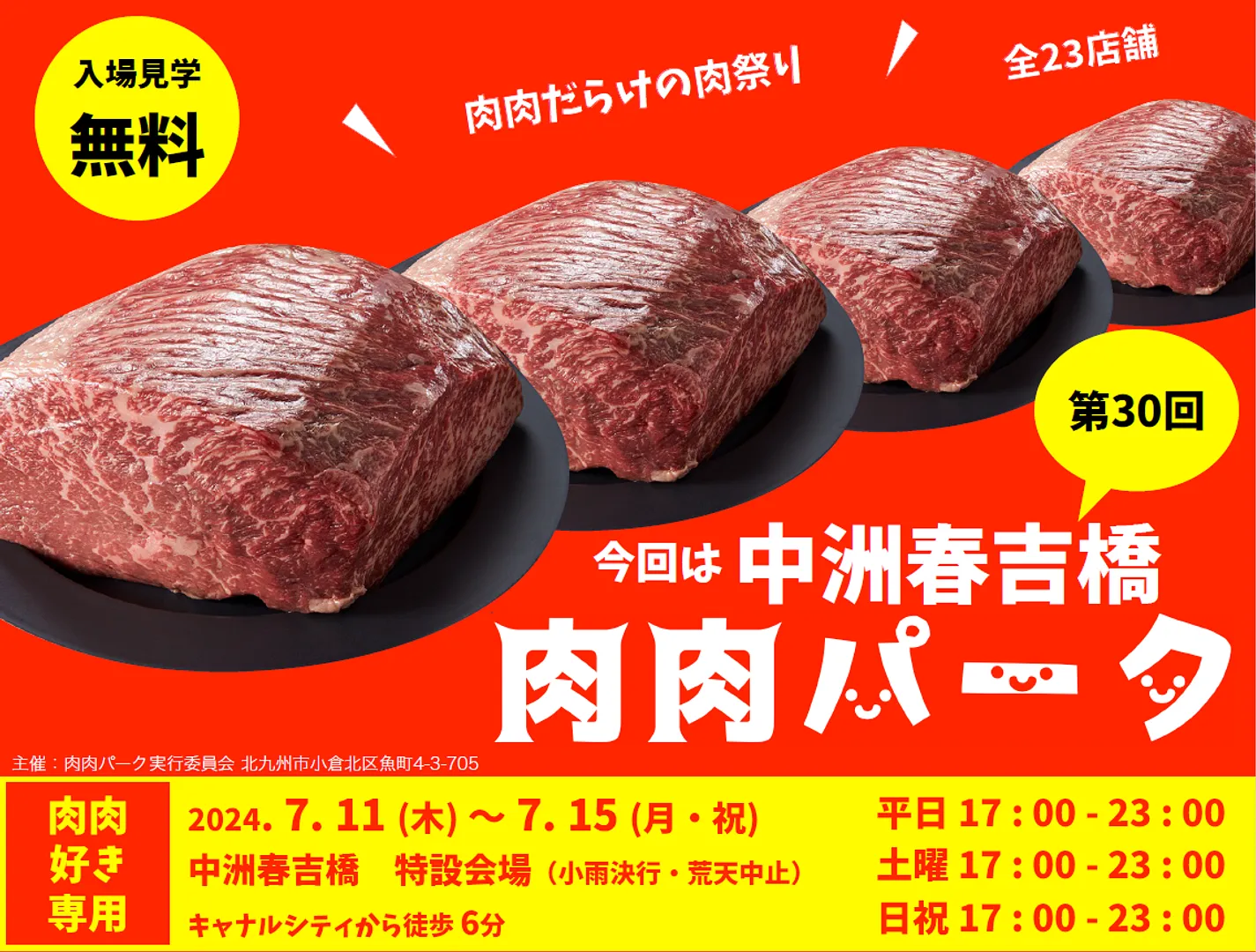 7月11日(木曜日)~7月15日(月曜日・祝日)、肉肉だらけの肉祭り『 肉肉パーク 中洲春吉橋』が開催されます。県内外から人気店全23店舗が出店、各店自慢の料理を提供。肉肉パーク限定メニューも!