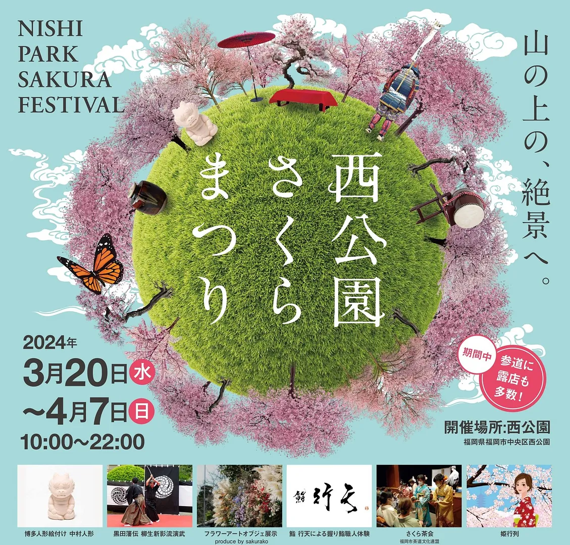 3月20日(水曜日・祝日)の西公園(荒津山)山開き神事からスタート。大鳥居参道坂道、光雲神社境内、舞鶴館、立帰天満宮など西公園エリアでの日本文化体験(茶会、作陶、博多人形絵付)や餅つき、ライブペイント、露店縁日、フラワーアーティストによる境内装飾、姫行列、鮨職人による子どもを対象にした握り鮨体験など、期間中は楽しいイベントが盛りだくさんですよ。