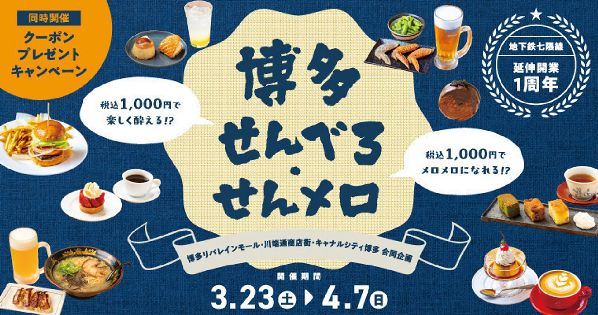 『地下鉄七隈線 延伸1周年企画』やキャナルシティ博多・博多リバレインモール・川端通商店街の『3施設合同企画』などのイベントやお得なキャンペーンが盛りだくさん!