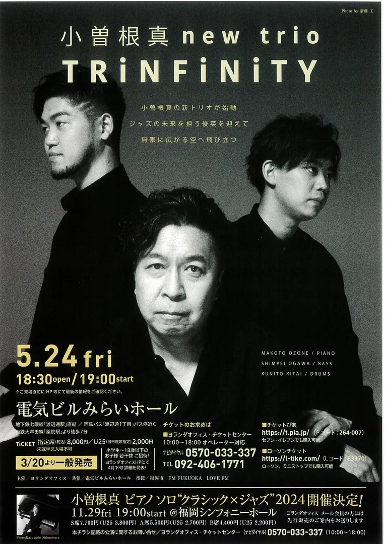 小曽根真 new trio TRiNFiNiTY(トリンフィニティ) 公演【電気ビルみらいホール】2024年 ~ジャズの未来を担う二人の俊英を迎えて小曽根真の新トリオが始動!