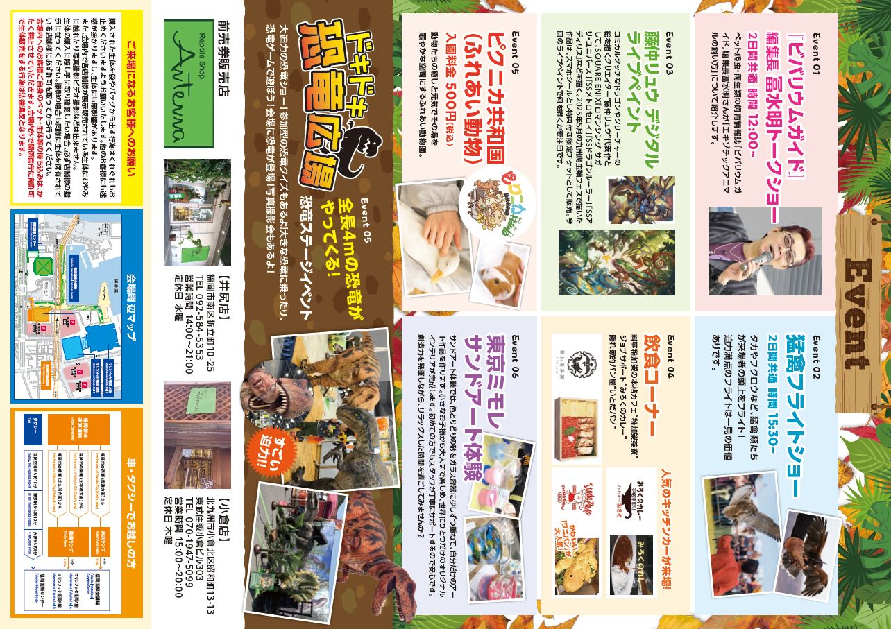 『ビバリウムガイド』編集長冨水明さんのトークショー、猛禽フライトショー、藤仲リュウ氏によるデジタルライブペイントや、大迫力の恐竜ステージイベントなど、見どころ盛りだくさん!人気のキッチンカーが来場する飲食コーナーも登場!