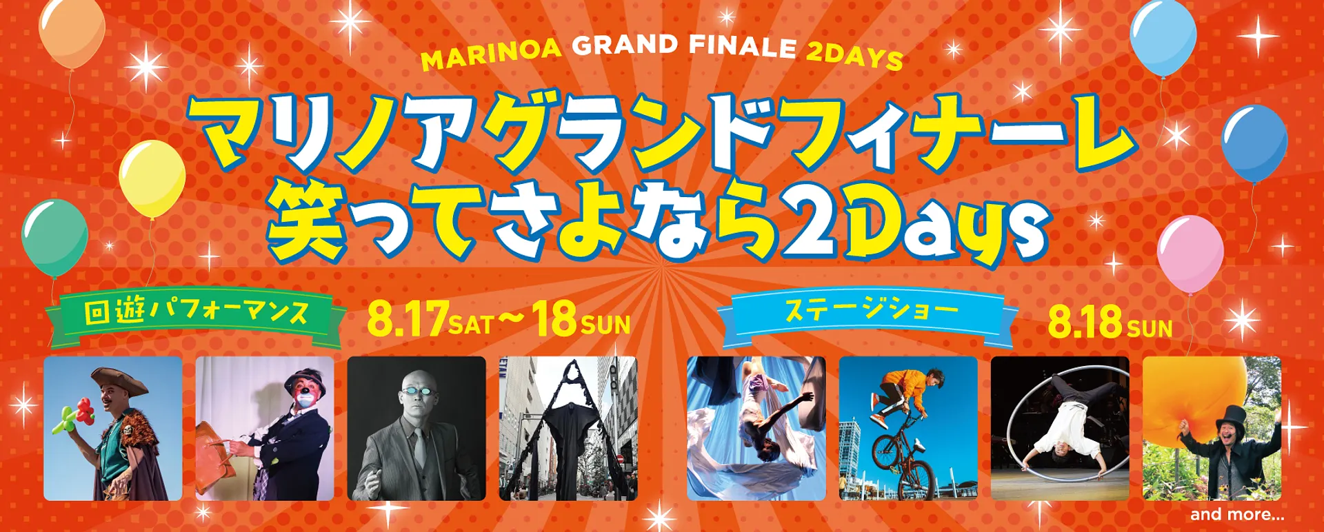 マリノア グランドフィナーレ 笑ってさよなら 2Days: 2024年8月17日(土曜日)~8月18日(日曜日) ≫パフォーマンスイベントスケジュールはイベント詳細ページをご確認ください。