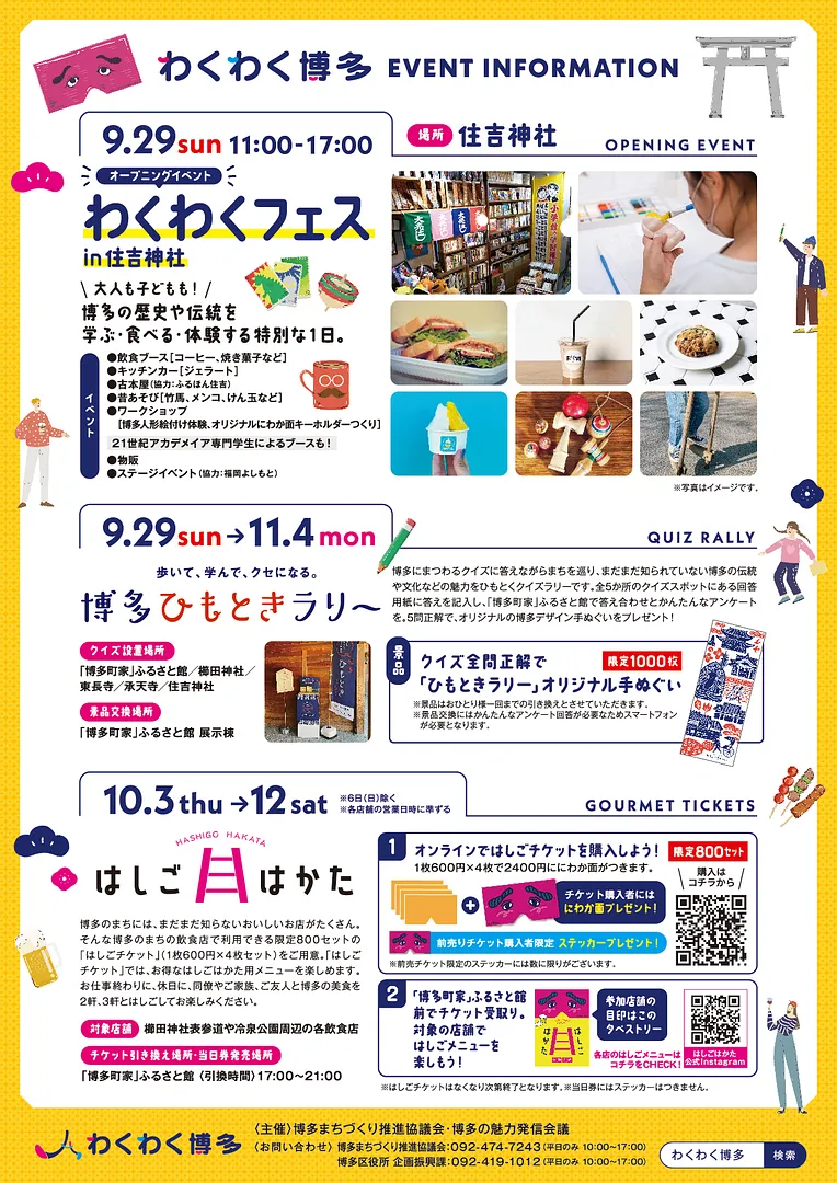 わくわくフェス in 住吉神社:筑前國一之宮 住吉神社(福岡市博多区住吉3丁目1-51)/ 博多ひもときラリー:「博多町家」ふるさと館(福岡市博多区冷泉町6-10)他/ はしごはかた:櫛田神社表参道周辺や冷泉公園周辺の対象店舗