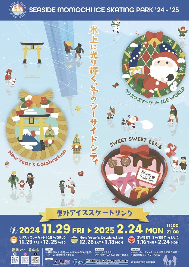 福岡タワー南側の広場に本物の氷を使った屋外アイススケートリンクが登場し、クリスマスマーケットからスタート、ニューイヤーズイベント、バレンタインイベントと百道浜エリアを3つのシーズンで彩りながら開催します。