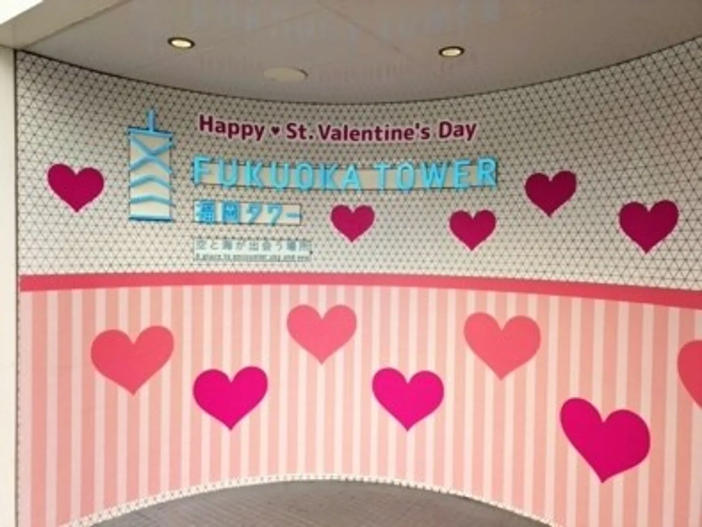 福岡タワーの入り口と、1階のエントランスにある2ヶ所のフォトスポットがハートバージョンになります。恋愛のパワースポットで、記念撮影も楽しんで。