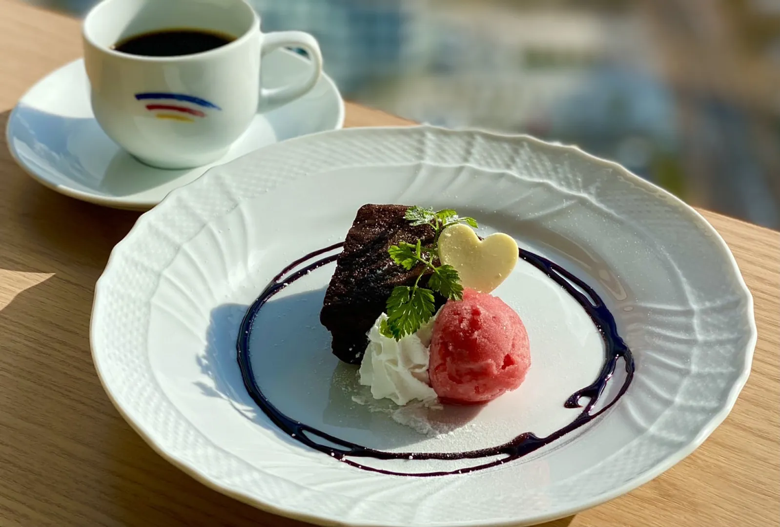 福岡の街を一望できる展望カフェ ルフージュでは、バレンタイン限定メニュー「ガトーショコラ」を提供します。ガトーショコラのほろ苦さと苺の酸味がマッチして、ひと口ごとに幸せな気分になれそう^^