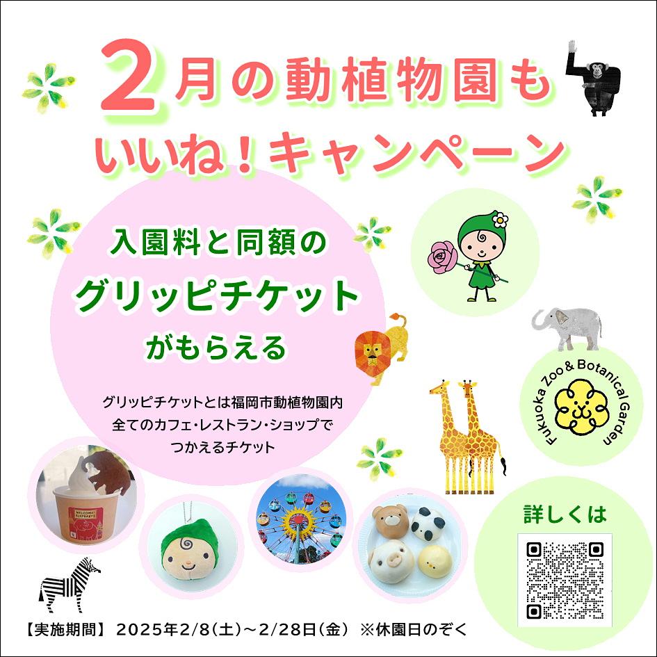 さらに、3月開催を間近に控える Fukuoka Flower Show Pre-Event の特別企画「みんなが繋がる国際交流フェス」を開催する2月8日(土曜日)から、動植物園入園の際にお支払いされた入園料と同額のグリッピチケットがもらえる「2月の動植物園もいいね!キャンペーン」を実施します(2月28日(金曜日)まで)。
