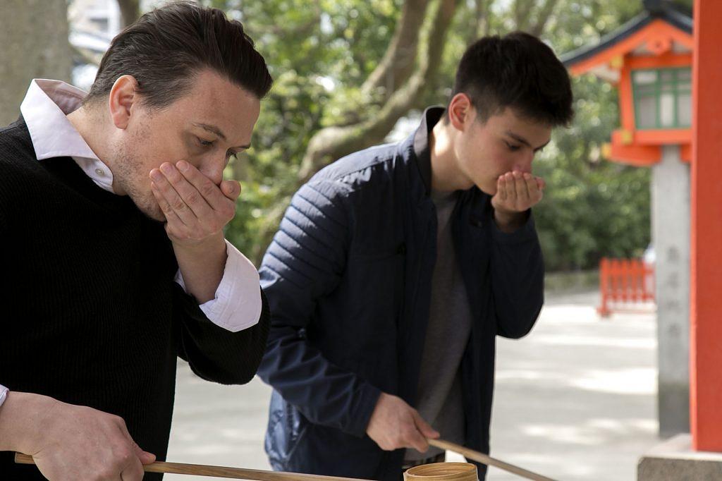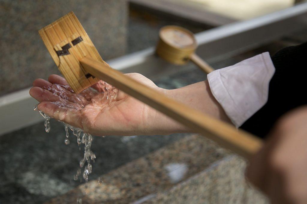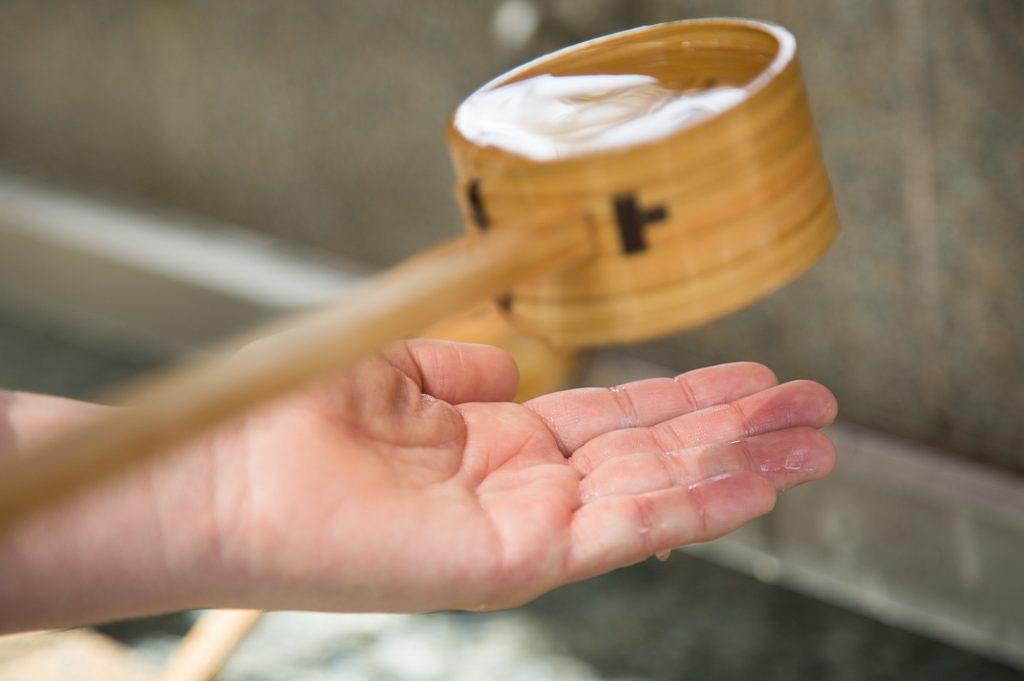 再び柄杓を右手に持ち替え、左の掌(てのひら)に水を受けて口をすすぎます。