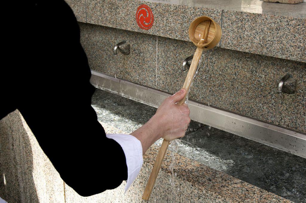 手を清め終わったら、残った水が柄杓の柄にかかるよう流し柄杓を清めます。