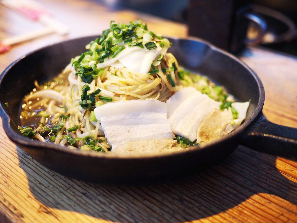 そのままスキレットで提供される人気メニューの焼きラーメン(950円)。
