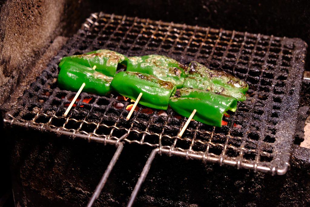 ガスではなく、わざわざ炭火を起こして焼き上げるから、鶏だけでなく野菜類も美味! 見事な焼き目のピーマン(100円)