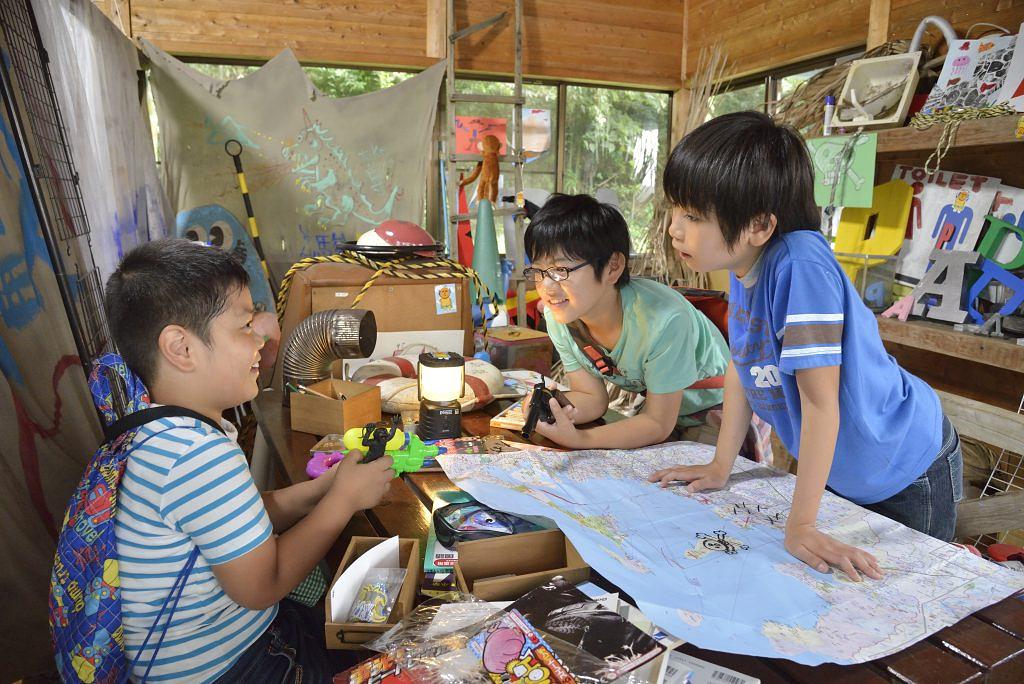 自転車での冒険に欠かせないガイコツマークや姪浜やターゲットの印が記された福岡市の地図や3人の宝物が所狭しと置かれている。