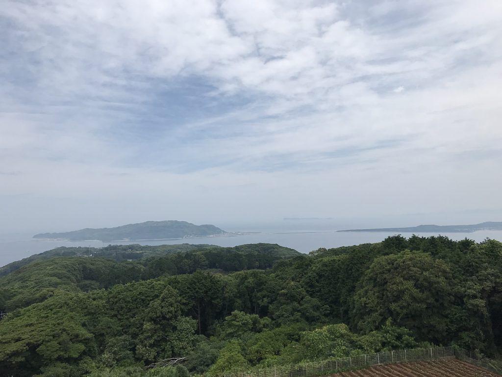 ロケ地となった能古島の山頂195mにある展望台では、福岡市街や玄界灘などを眺望でき、遠くには小呂島(おろのしま)も見ることができます。(写真は展望台からの眺望。中央の島は志賀島、その右手にはうっすらと猫の島で有名な相島も見えます。)