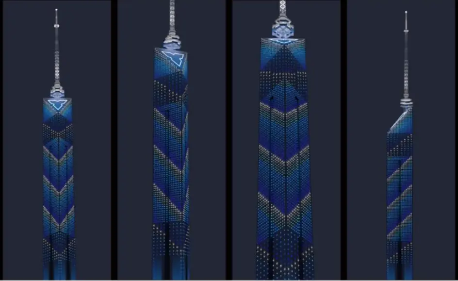 新しいデザインは、塔体頂部を斜めにカットした断面のⅤラインを反復させることで、タワーの特徴