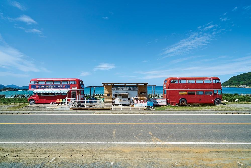 真っ赤な2階建てのロンドンバスをお店にしたカフェ。佐世保市・山中牧場で作られた、添加物を使わないジェラートが名物。バスの中で海を眺めながら食べられるなど写真のねらいどころがいっぱい。
