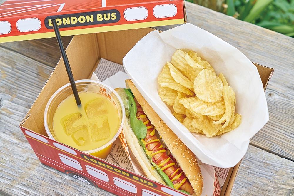 ホットドッグにドリンクやポテトチップが付くバスボックスセット(¥1,000)