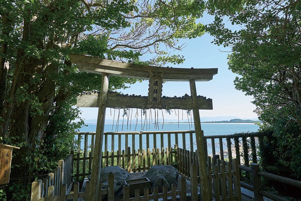 海を望む鳥居。入口にある御潮井の砂で、身を清めてからお参りしよう