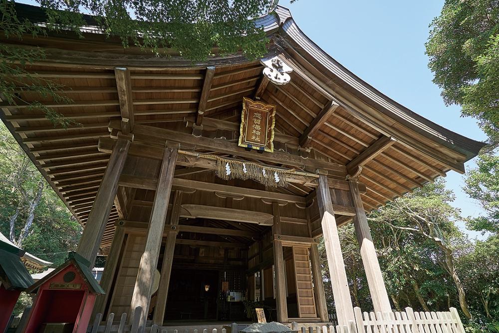 海の神様である綿津見三神(わたつみさんしん)が祀られ、古くから海上守護の神様として信仰されている。全国の海神社の総本社で、現在も海上安全の祈願が行われている。鳥居越しに見る海も格別。