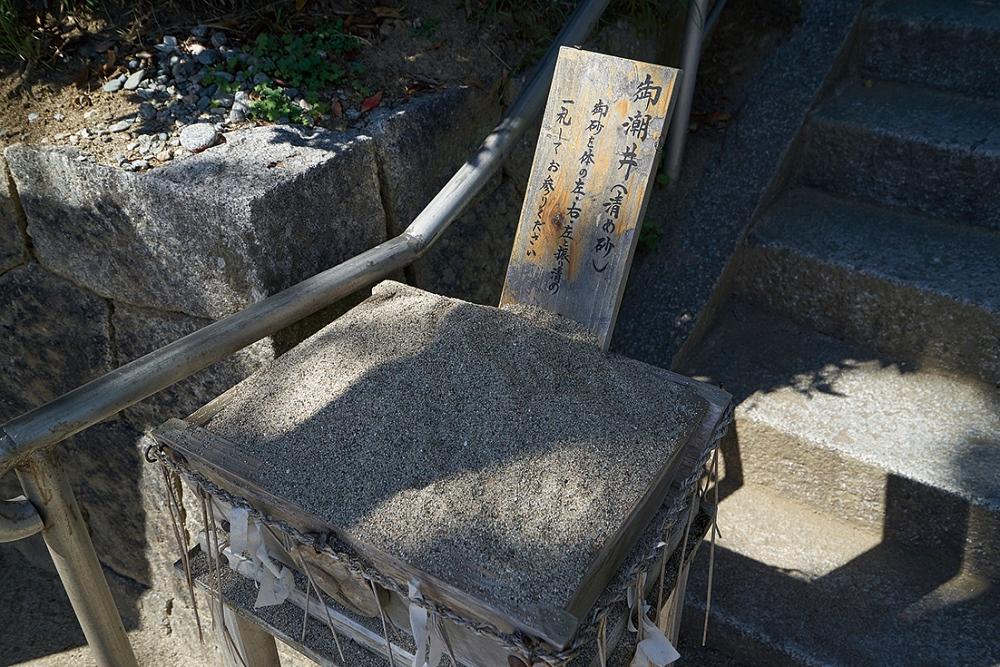 参拝の前に身を清めるための御潮井。砂を左、右、左の順に軽く振り清める