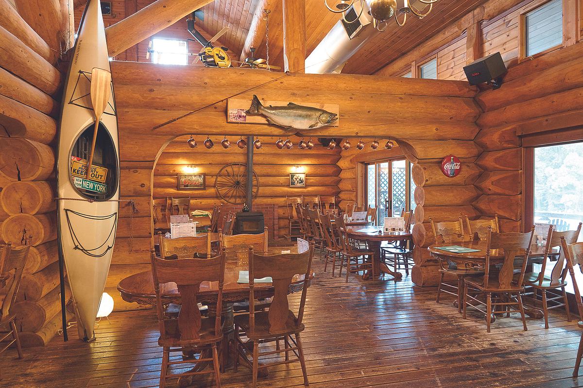 森の湖面に立つログハウスのレストラン。自然を生かした開放的な空間で、のんびり食事が楽しめる。香り豊かな自家製スモーク料理やステーキからパスタ、ピザまでシェフのオススメ料理がそろう。