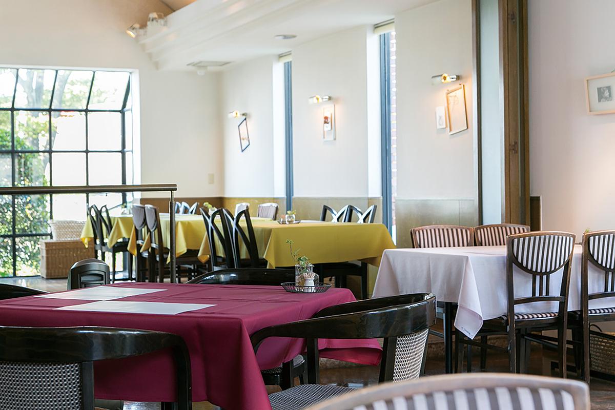 ショップに併設したレストランスペース。テーブル間をゆったりもたせ、落ち着いた空間を演出する