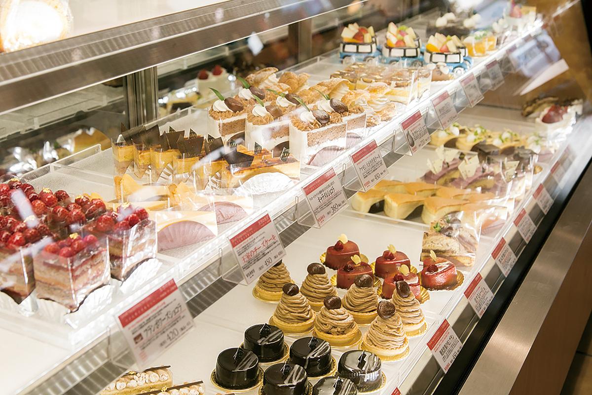 スイーツは40種以上。おすすめはイチゴのショートケーキ(¥420)。焼き菓子も40種以上そろう