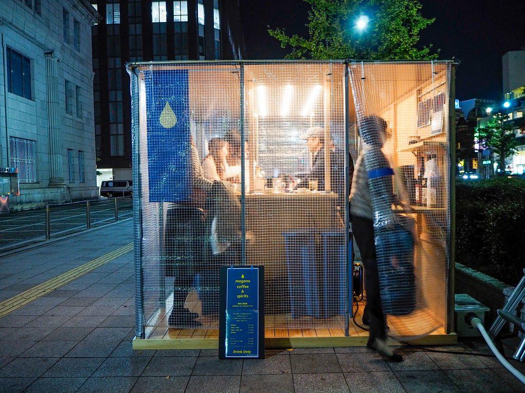天神4丁目「日本銀行福岡支店」前で、ひときわ目を引くのが「megane coffee & spirits(メガネ コーヒー アンド スピリッツ)」。ハンドドリップで一杯立てするコーヒーと、焼酎やジンなどの蒸溜酒を楽しめる“喫茶&BAR”のような屋台です。