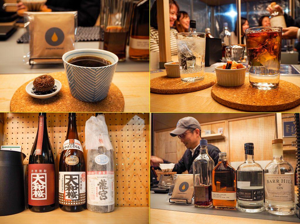 コーヒー¥500、珈琲焼酎¥600。芋焼酎「大和桜」や、珍しいジンにも注目。アルコールにはおつまみ、コーヒーにはミニドーナツ付き[/caption]