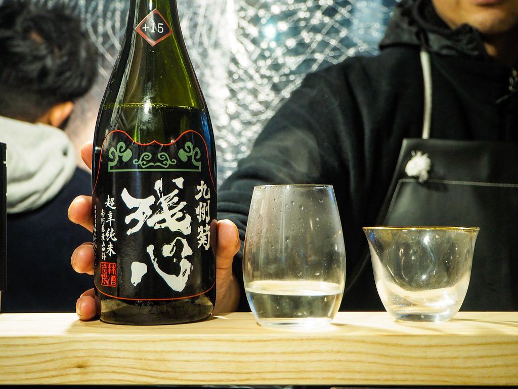 こんなにたくさんの日本酒が並ぶ屋台はここだけ。福岡県みやこ町の酒蔵「林龍平酒造場」で醸されている「残心 超辛純米」(ミニ¥400〜)は、お燗もよし