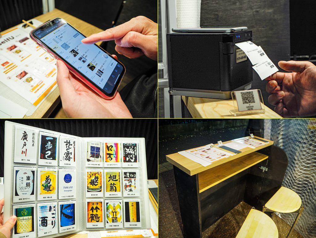 “ネオ屋台”と呼ばれる所以は、屋台のデザインやシステムにも。入口そばの独立した客席や、座面を少し傾けて座りやすさを追求したイス、厨房も機能的で、日本酒メニューはラベルをわかりやすく並べています。さらには、スマートフォン&2次元バーコードを使用して注文できるオーダーシステム「SelfU」も、九州初導入!