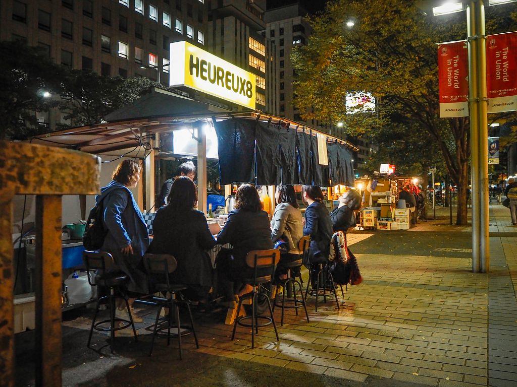 BiVi福岡前で、黄色の看板に光を灯すのは、本格フレンチやカジュアルな洋食メニューを味わえる屋台「HEUREUX 8」(ウールー ユイット)。「HEUREUX(ウールー)」は、 “幸せな”という意味をもつフランス語なのだとか。