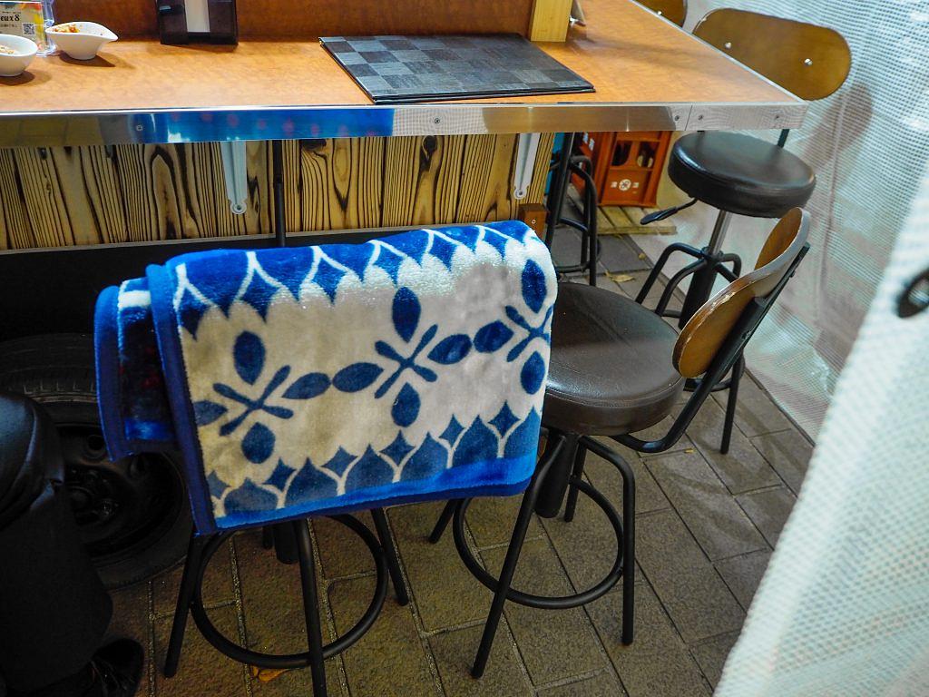 背もたれと高さ調節機能を備えたクッション性のあるイスやブランケットも完備し、観光客の方には、近隣のオススメ屋台情報を教えるなど、随所に野茂さんの心配りが光ります。「仕事帰りにサクッとパスタだけ食べて帰る!」のもOKなので、気軽な普段使いを楽しんでくださいね。