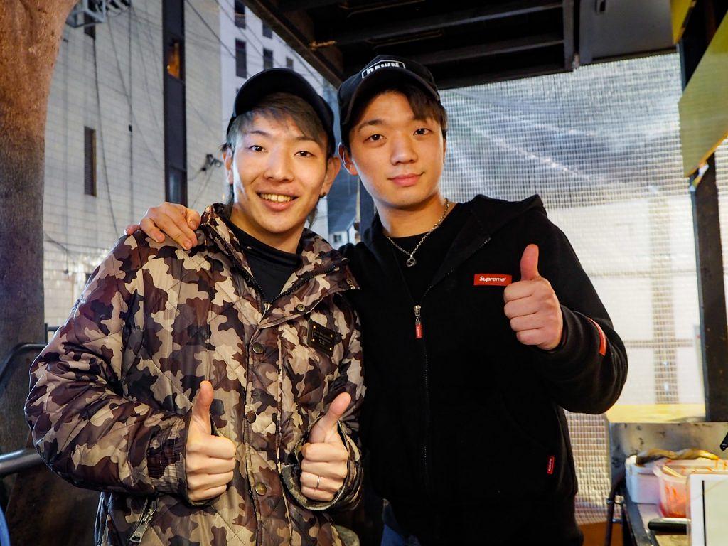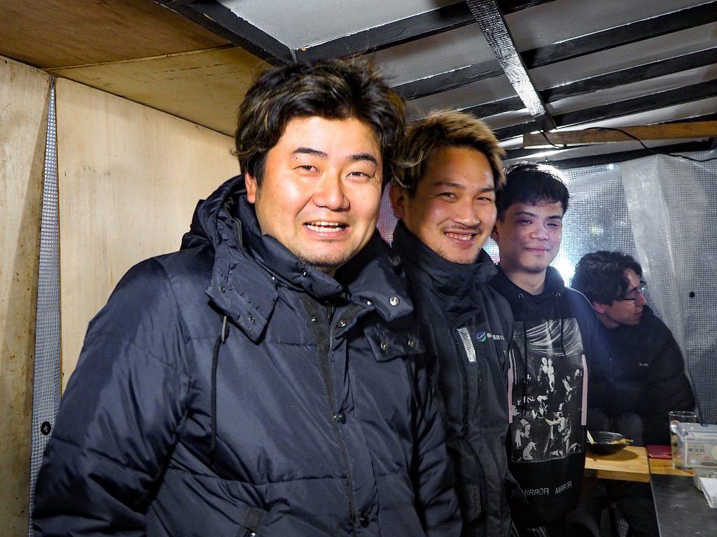 続いて訪れたのは「たけちゃん fr 司」の並びに店を構える「博多屋台よっちゃん」です。店を盛り立てるのは、福岡市内の屋台で最年少となる21歳の店主・高田吉昌さん。共に働くスタッフも全員同級生だそうで、明るく活気に満ちた雰囲気が暖簾の外にもこぼれています。高田さんは、中洲エリアの人気屋台「中洲十番」でのアルバイトがきっかけでこの道へ。