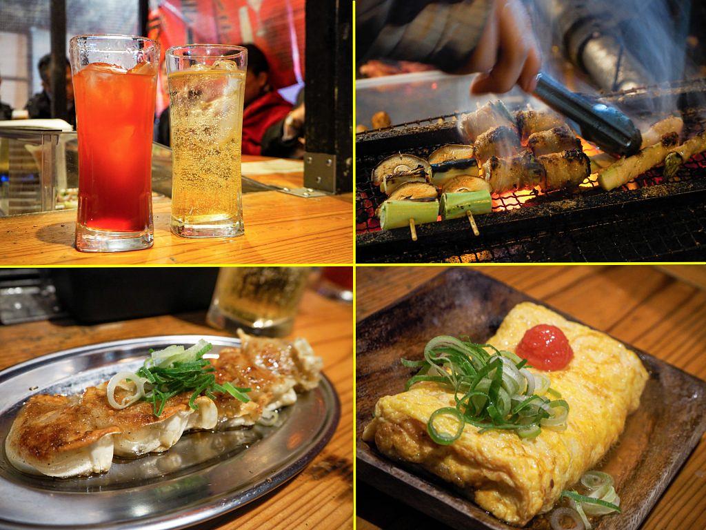 左上から時計回りに、カシスオレンジ(¥750)、ハニーハイボール(¥850)。しいたけ、ネギ、アスパラなどの「野菜巻き3本盛り」(¥800)。「明太だし巻き卵焼き」(¥900)。「博多一口餃子」(¥800)