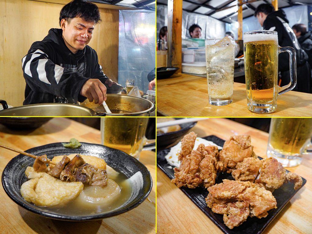 左上から時計回りに、大鍋の中には赤味噌で煮込んだもつ煮込み(¥650)が。アルコールはチューハイ¥450〜と良心価格。「鶏の唐揚げ」(単品¥500)、おでんは1個¥100〜。ネタには博多らしい「餃子巻き」(¥150)も
