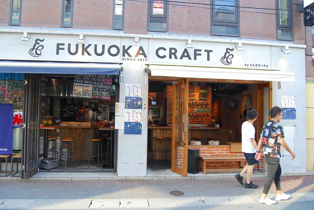 天神駅から徒歩圏内にある大名エリア。若者や国内外の観光客で賑わいを見せる紺屋町商店街の近くに、オープンスタイルのバーがあります。その名も『FUKUOKA CRAFT by エルボラーチョ』。カウンターとテーブル席でラフに構成された店内には、中央にクラフトビールを注ぐためのタップがずらりと並び、店内に隣接する小さなスペースにある醸造タンクの姿が目を引きます。