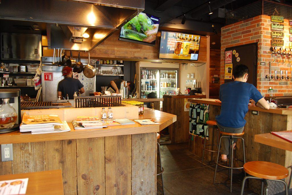カジュアルに飲めるカウンターの奥にはゆっくり食事が楽しめるテーブル席も