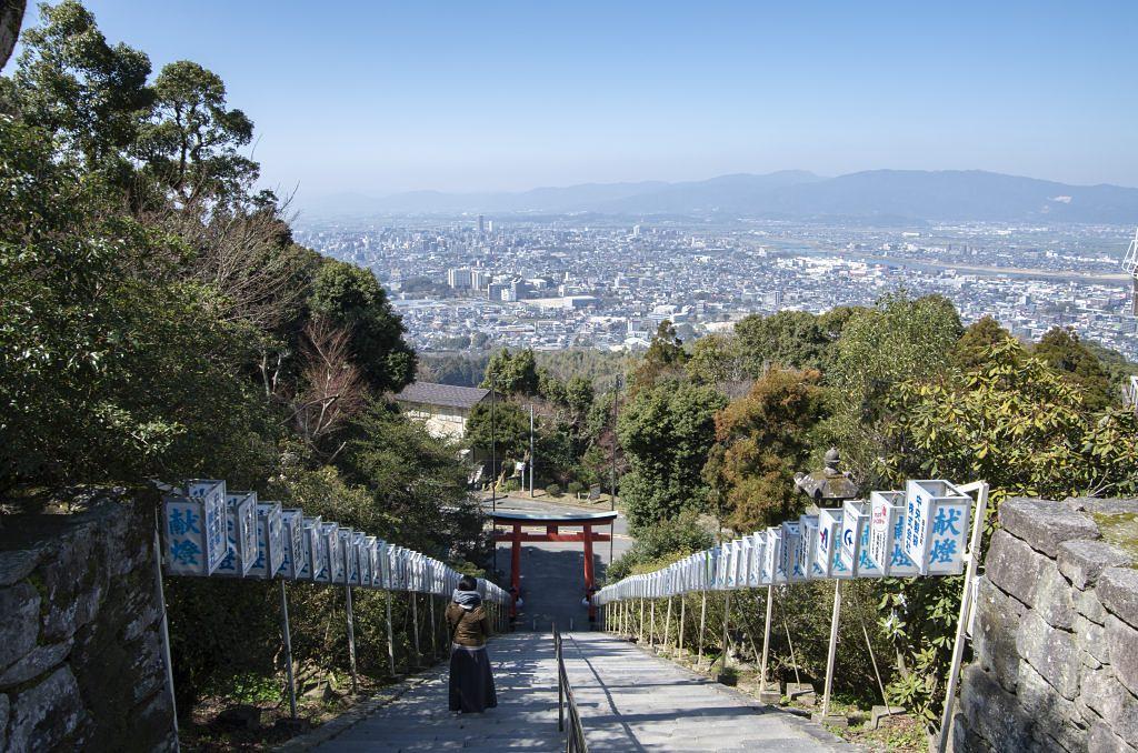 長い長い参道の階段を登る途中、振り返ると大展望