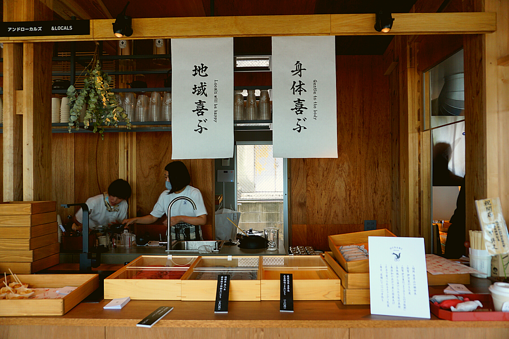 八女茶を中心に九州各地域から届けられる旬な具材を厳選し、様々なメニューを楽しめるカフェもあります。福岡英彦山の棚田米、佐賀伊万里のもち麦と「まさ子さんの万能酢」などローカル農産品を使用して、ヘルシーでおいしい「旅するおいなり」を毎日店舗にて一つ一つ手作りしています。